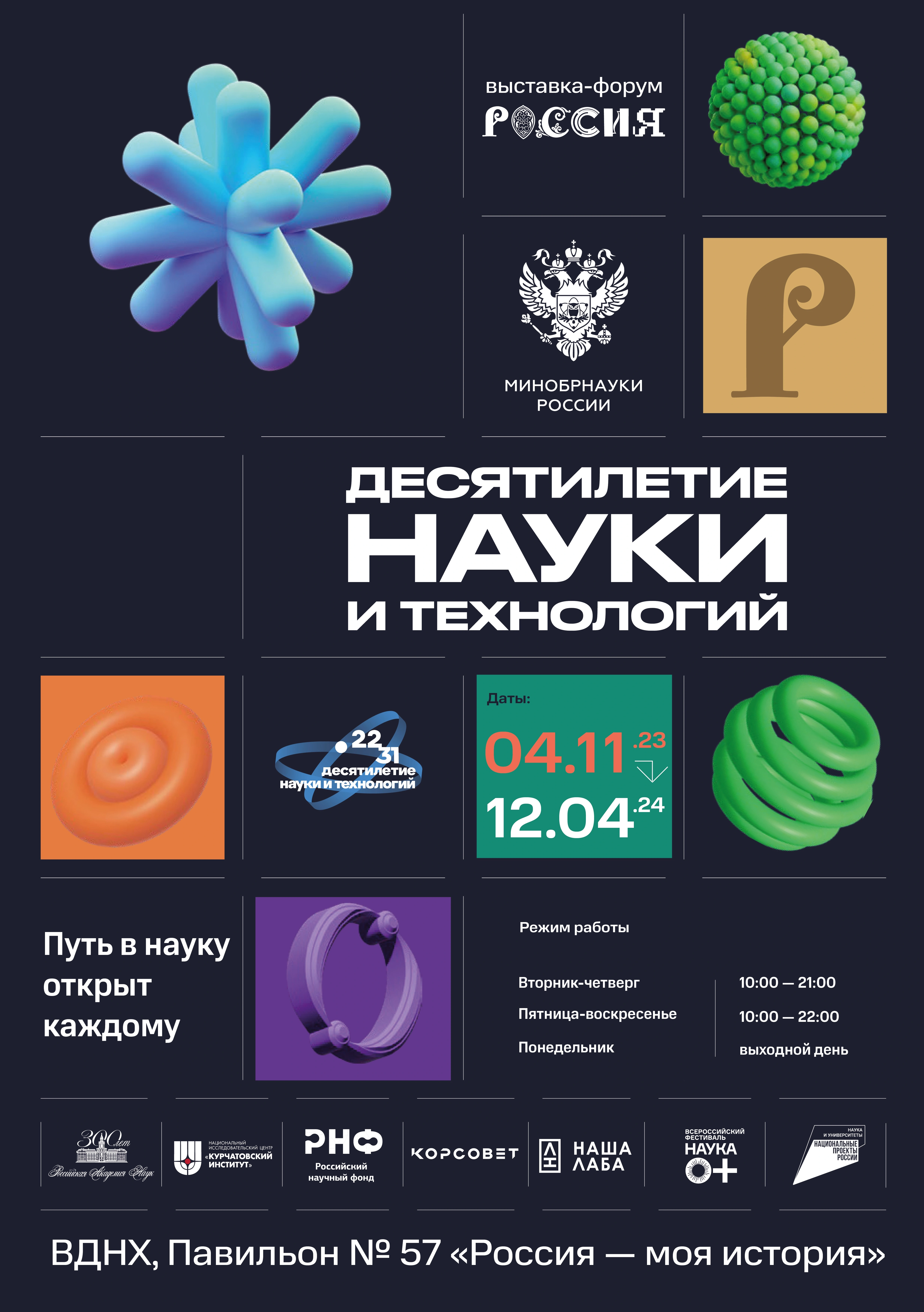 Минобрнауки России будет организована интерактивная мультимедийная выставка «Десятилетие науки и технологий», посвященная передовым отечественным достижениям в научно-технологической сфере, а также трансформации высшей школы. Ее главная цель — рассказать гостям о достижениях и перспективах отечественной науки, продемонстрировать возможности университетов настоящего и будущего, вовлечь молодое поколение в сферу исследований и разработок. Экспозиция включает в себя 14 тематических залов, отражающих достижения российских университетов и научных институтов и основные вызовы, которые стоят сегодня перед академическим сообществом.